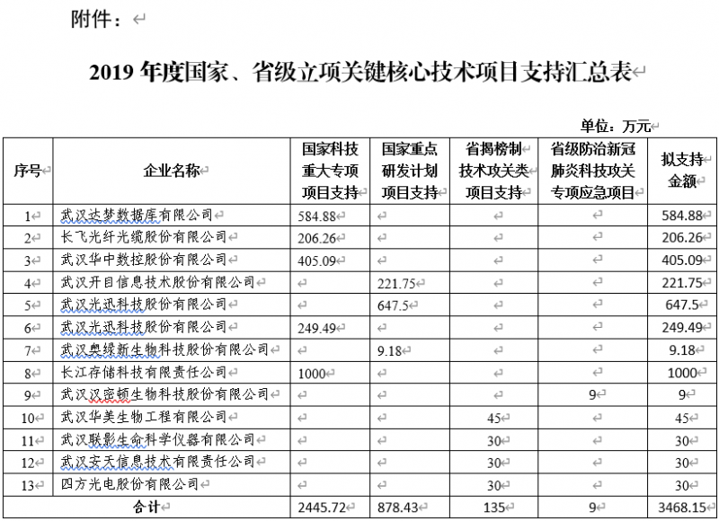 按照《關(guān)于申報(bào)東湖高新區(qū)2019年度國(guó)家、省級(jí)立項(xiàng)關(guān)鍵核心技術(shù)項(xiàng)目支持的通知》要求以及管委會(huì)相關(guān)規(guī)定,經(jīng)企業(yè)申報(bào)、審核、實(shí)地考察等流程,現(xiàn)將支持結(jié)果予以公示,公示期為2020年6月9日-6月15日。如有異議,請(qǐng)于6月15日下午17:00前將書(shū)面意見(jiàn)(蓋公司/單位公章)反饋至管委會(huì)科創(chuàng)局,逾期不予受理。
